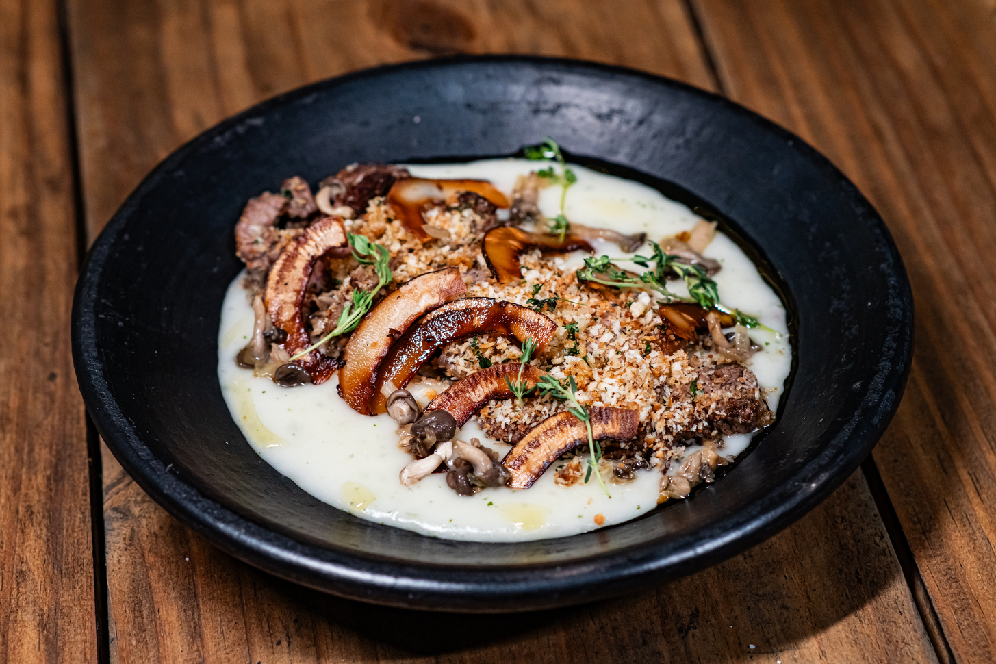 Bife Ancho Com Crosta De Ervas Fatiado, Cama De Cogumelos Shiitake, Mousseline De Mandioca E Coco, Finalizado Com Tomilho E Chips De Coco Fresco.