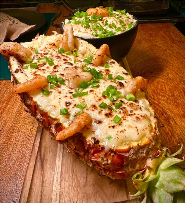 Camarão Selado No Azeite, Abacaxi Caramelizado E Um Creme De Catupiry Com Muçarela E Leite De Coco.