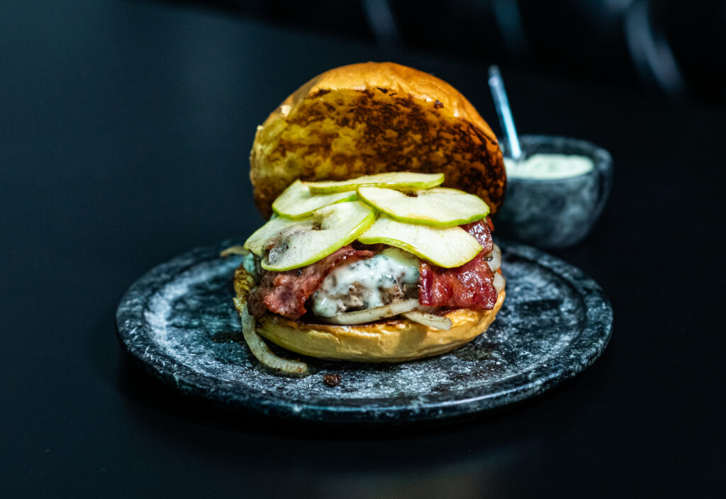 Pão Brioche, Cebola Chapeada, Blend 150 Gramas, Queijo Gorgonzola, Bacon Crocante E Maçã Verde Caramelizada.