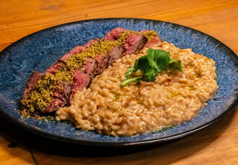 Filé mignon com farofa crocante feita no azeite verde de ervas e acompanhado de risoto de cebola caramelizada com queijo mineiro premium.