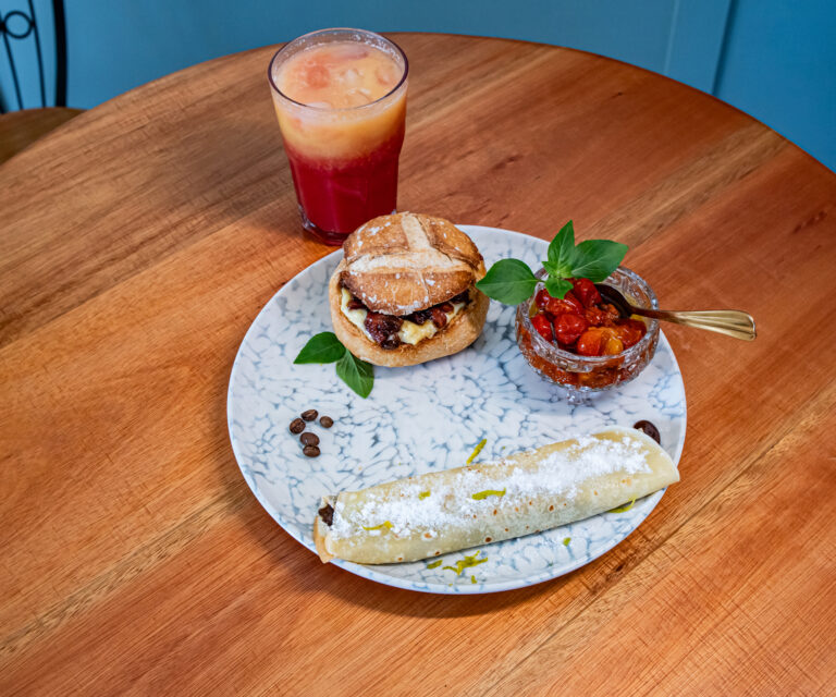 Acompanha Crepe (Com Notas Cítricas) Recheado Com Ganache De Chocolate Com Café E Açúcar De Confeiteiro Maçaricado e Suco Refrescante De Melancia Com Maracujá.
