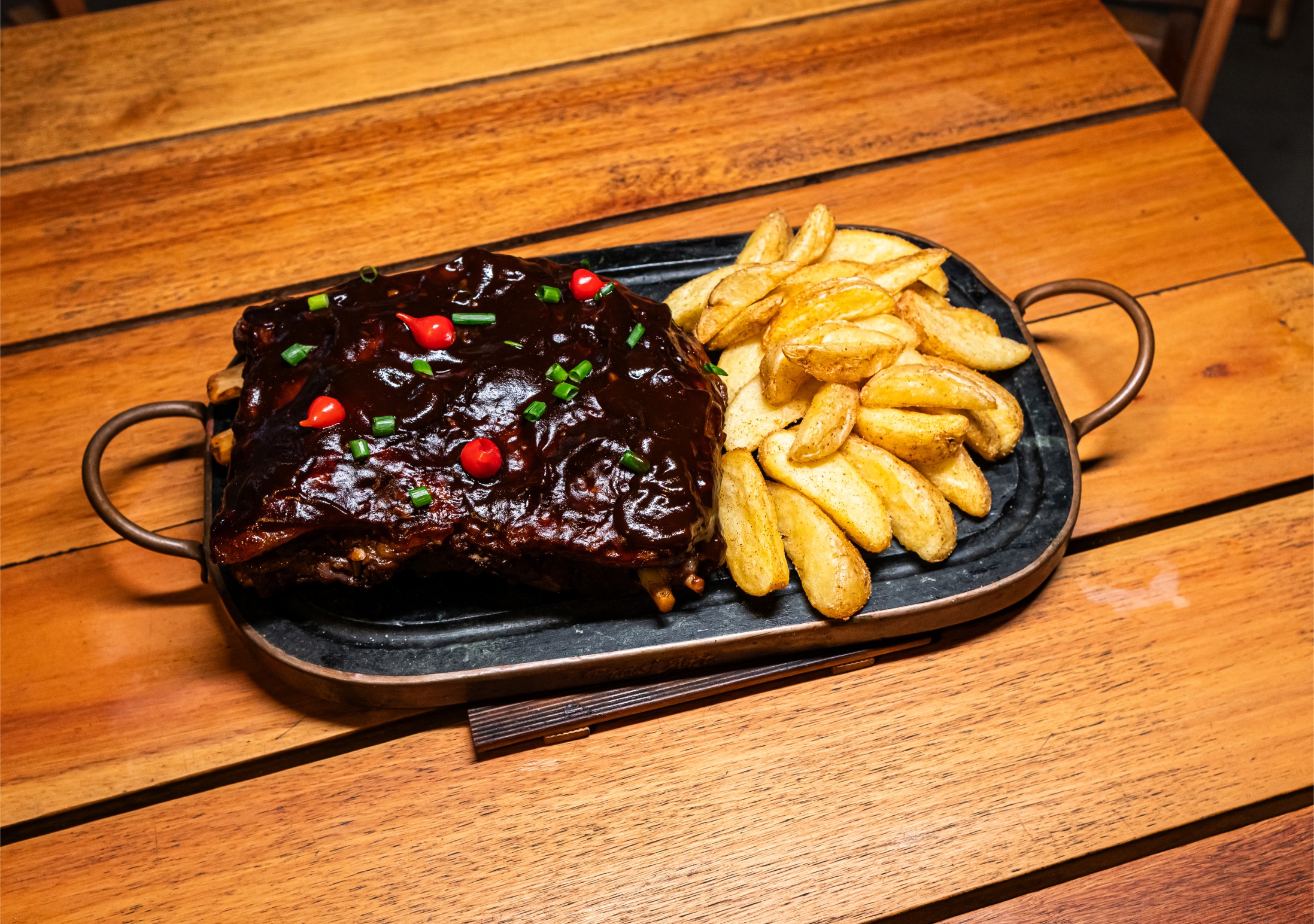 Costela Suína Premium Com Barbecue Com Acompanhamento De Batatas Rústicas Com Tempero Especial Levemente Apimentado.